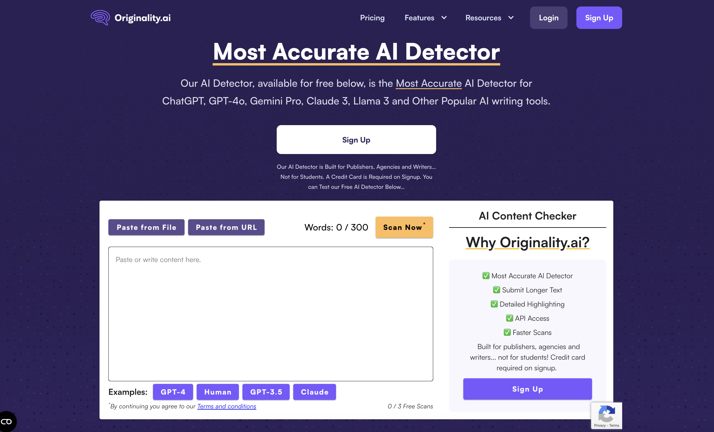 Originality.ai est conçu pour détecter le contenu généré par l'IA dans différents modèles de langage, notamment ChatGPT, GPT-4o, Gemini Pro, Claude 3, Llama 3 et d'autres. Il se présente comme le « détecteur d'IA le plus précis » et cible les éditeurs, les agences et les auteurs, mais pas les étudiants.