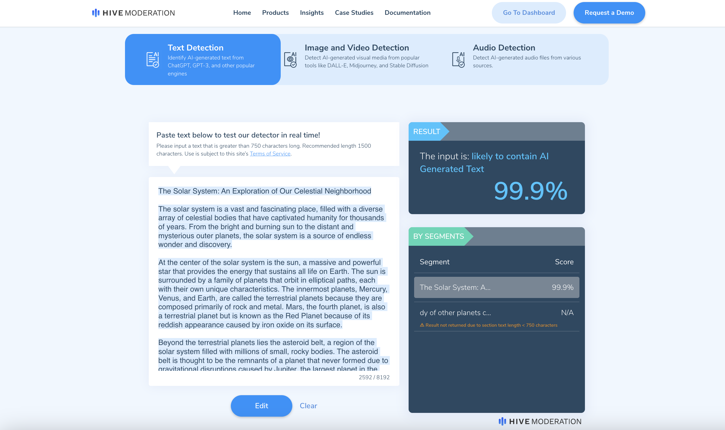 Hive Moderation, une entreprise spécialisée dans la modération de contenu, propose un détecteur de contenu IA doté d'un différenciateur unique. Contrairement à la plupart des autres exemples répertoriés ici, il est capable de vérifier le contenu IA sur plusieurs formats multimédias, notamment le texte, l'audio et l'image.